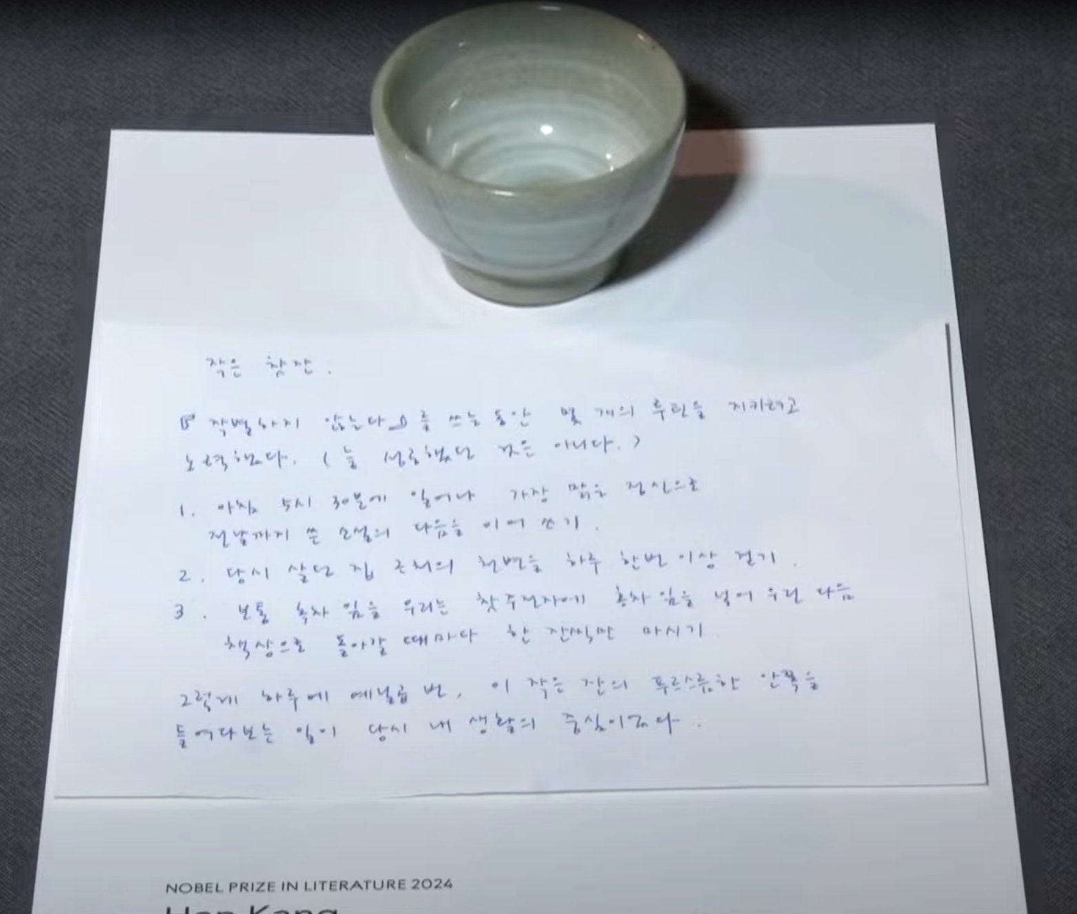 Uma xícara de chá e uma mensagem doadas por Han Kang ao Museu do Prêmio Nobel em Estocolmo