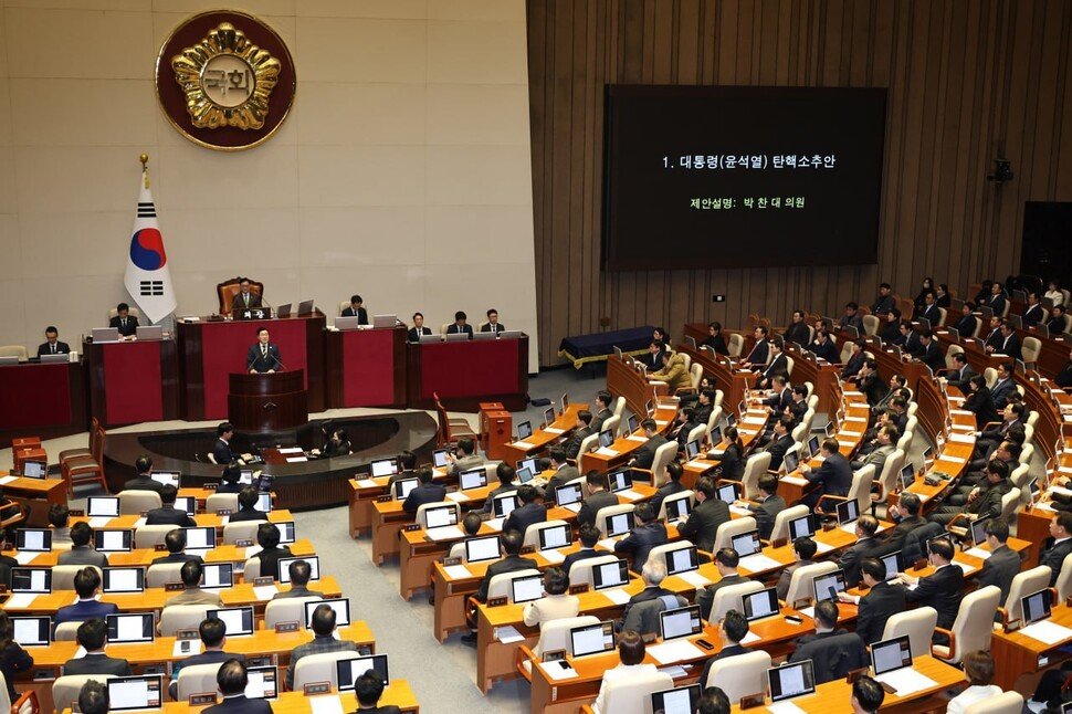 Em 14 de dezembro de 2024, o parlamento realizou uma sessão plenária em que todos os 300 deputados participaram da votação. Com 204 votos a favor, 85 contra, 3 abstenções e 8 votos nulos, a moção de impeachment do presidente foi aprovada. Para a aprovação do impeachment, era necessário o apoio de pelo menos 200 dos 300 parlamentares. Entre os votos favoráveis, estavam 192 de membros da oposição, como o Partido Democrático, e 12 de parlamentares do Partido do Poder Popular.