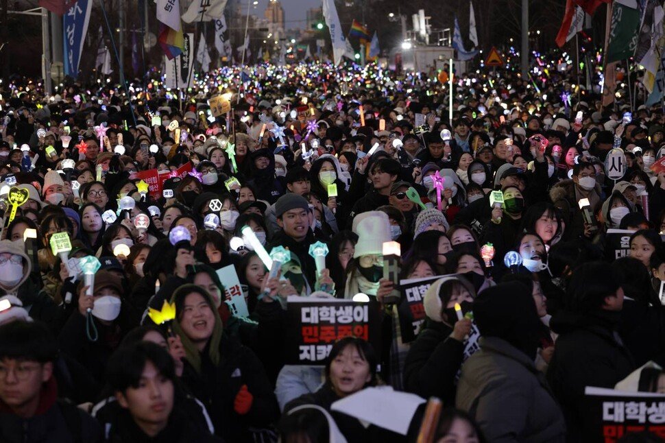 Cidadãos presentes na vigília com velas realizada em frente à Assembleia Nacional em Yeouido, Seul, no dia 14 de dezembro de 2024, comemoram com entusiasmo a aprovação do impeachment do presidente Yoon Suk-yeol. (Foto: Yonhap News)